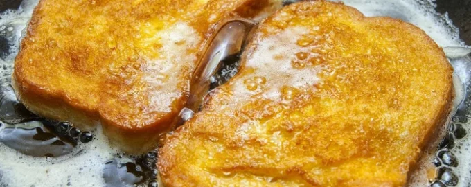 - Scaldare l’olio vegetale in una padella a fuoco medio, immergere ogni fetta di pagnotta su entrambi i lati nel composto di uova e latte, posizionarla sulla padella e friggerla su entrambi i lati fino a doratura.